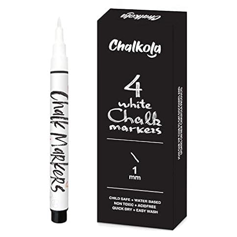 Extra Fine Tip White Chalk Markers | 1mm Nib | Pack of 4 Chalk Pens – Use on Chalkboard, Windows, Blackboard, Signs, Glass, Bistro – Water Based, Non-Toxic, Wet Wipe Erasable
