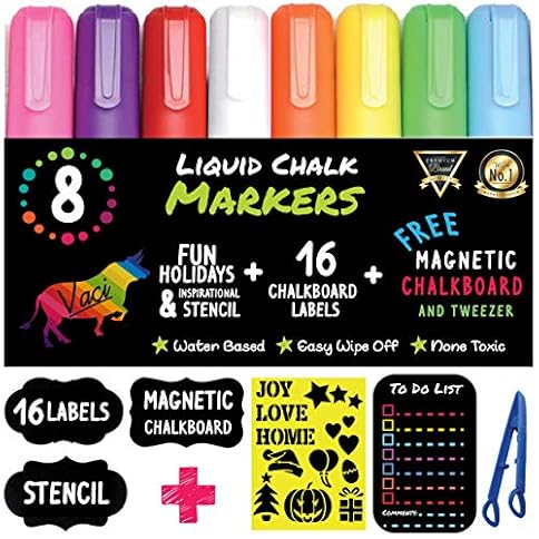 Chalk Markers by Vaci, Pack of 8 + Christmas Drawing Stencils + 16 Labels, Premium Liquid Chalkboard Neon Pens, Including Stencil,Tweezers and Magnetic Chalkboard, Bullet or Chisel Reversible Tips