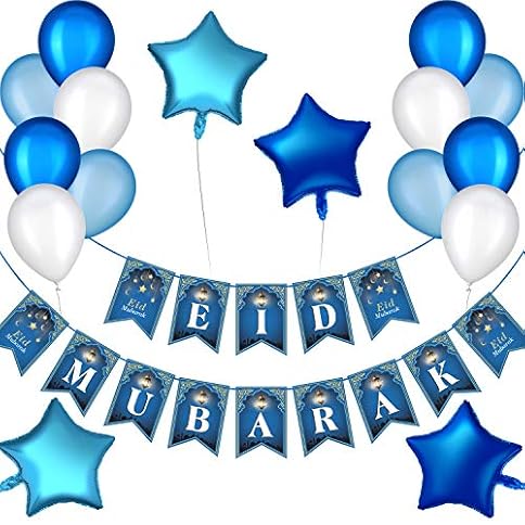 Eid Mubarak Banner Kit – No DIY Required Eid Mubarak Party Decorations and Balloons Muslim Ramadan Party Supplies, Blue Eid Mubarak Celebration Decoration for Muslim